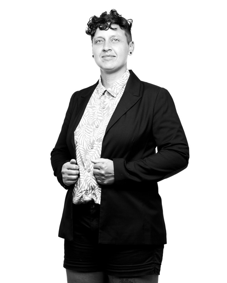 (Photograph description: A black and white photograph of a white, non-binary person with short curly hair wearing a black jacket over a floral shirt and shorts, smiles into the camera. They are in front of a white background. By Rich Soublet. )